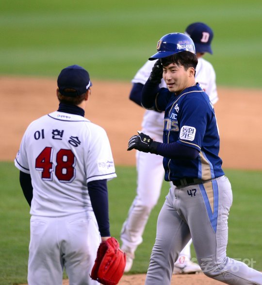 30일 서울 잠실야구장에서 ‘2016 타이어뱅크 KBO 리그’ 한국시리즈 2차전 NC다이노스와 두산베어스 경기가 열렸다. 1-5로 패한 후 NC 나성범이 더그아웃으로 가고 있다.