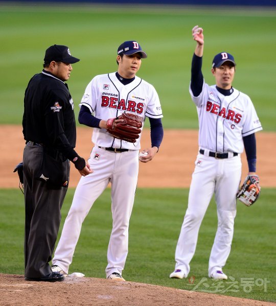 30일 서울 잠실야구장에서 ‘2016 타이어뱅크 KBO 리그’ 한국시리즈 2차전 NC다이노스와 두산베어스 경기가 열렸다. 선발 투수로 등판한 두산 장원준이 9회초 2사 1루 상황에서 자진 강판하고 있다.