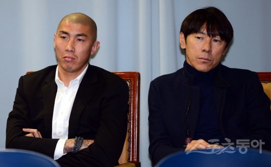 한국축구대표팀 슈틸리케 감독이 오는 11월 11일 캐나다와 친선경기, 15일 우즈벡과 2016 러시아월드컵 아시아최종예선을 앞두고 31일 서울 신문로 축구회관에서 축구대표팀 선수명단을 발표했다. 차두리 전력분석관과 신태용 코치가 참석해 슈틸리케 감독의 기자회견을 듣고 있다.