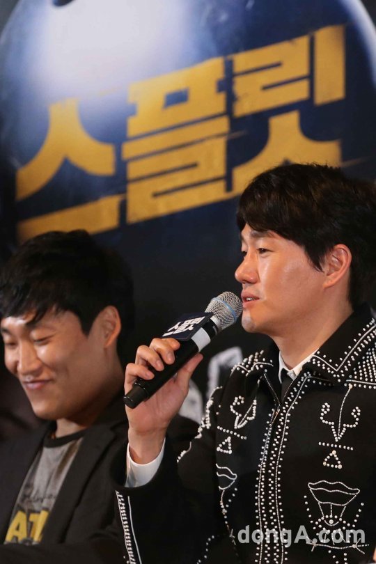 배우 유지태(오른쪽)가 31일 오후 서울 광진구 한 멀티플렉스 건대입구점에서 열린 영화 영화 '스플릿' 제작보고회에 참석해 인사말을 하고 있다.
