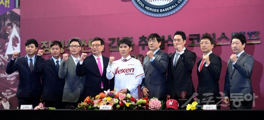 31일 서울 서울 고척스카이돔에서 넥센 장정석 신임 감독 취임식 및 코칭스태프 발표회가 열렸다. 취임식을 마치고 장정석 신임 감독과 코칭스텝이 화이팅을 외치고 있다.