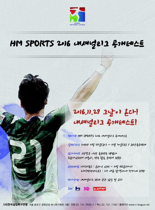 스포츠마케팅 전문회사 HM SPORTS의 후원으로 진행되는 ‘내셔널리그 공개테스트’는 선수선발 방식을 보다 개선하고 많은 기회를 통해 인재를 발굴하고자하는 취지에서 2014년부터 진행되는 행사다. 자세한 신청방법은 연맹 홈페이지(www.n-league.net)를 통해 확인 가능하다.