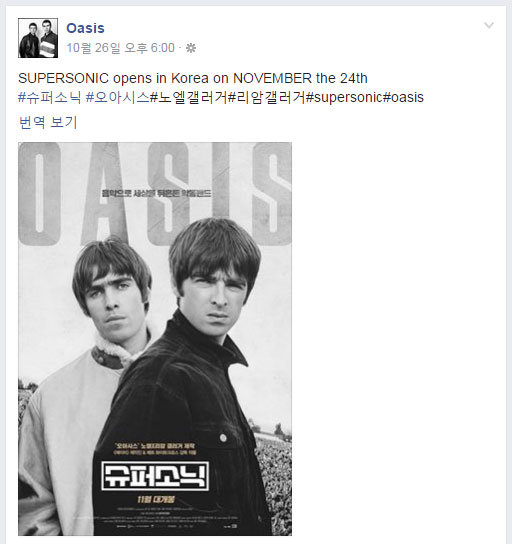 ‘오아시스 신드롬’을 탄생시키며 전 세계를 매혹시켰던 밴드 오아시스의 다큐멘터리 ‘슈퍼소닉’이 11월 24일 국내 개봉한다. 이가운데, 오아시스의 공식 SNS 계정에서 이를 직접 언급, 오아시스의 뜨거운 한국 사랑이 다시금 팬들 사이에서 화제를 불러일으키고 있다.