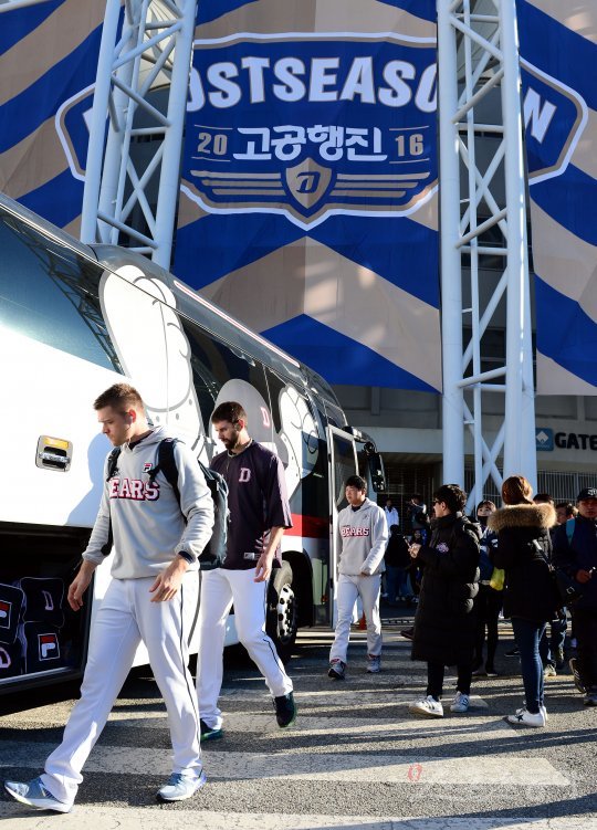 1일 창원 마산야구장에서 ‘2016 타이어뱅크 KBO리그’ 두산 베어스와 NC 다이노스의 한국시리즈 3차전 경기가 열린다. 두산 보우덴과 니퍼트가 구단버스에서 내려 야구장으로 향하고 있다.