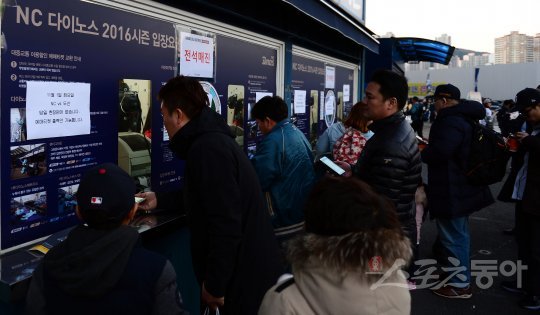 1일 창원 마산야구장에서 ‘2016 타이어뱅크 KBO리그’ 두산 베어스와 NC 다이노스의 한국시리즈 3차전 경기가 열린다. 마산야구장 11,000석이 모두 매진 된 가운데 야구팬들이 예매표를 찾고 있다.