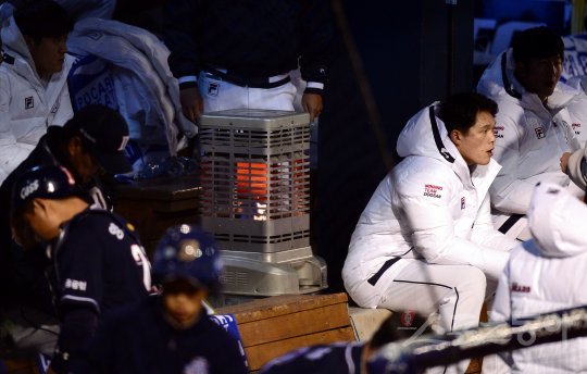 1일 창원시 마산야구장에서 ‘2016 타이어뱅크 KBO 리그’ 한국시리즈 3차전 두산베어스와 NC다이노스 경기가 열렸다. 추운 날씨에 두산 더그아웃에 난로가 켜 있다.