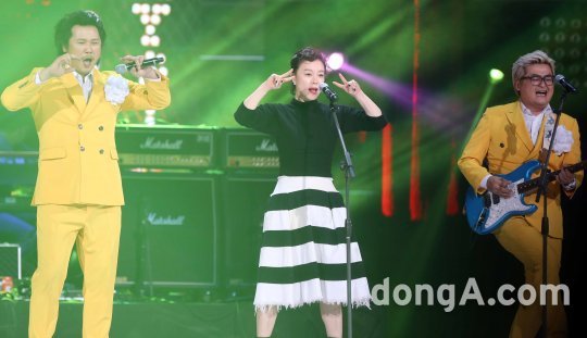 밴드 장미여관의 육중완(왼쪽)과 최화정이 1일 오후 서울 잠실체육관에서 열린 SBS파워 FM 20주년 콘서트에서 화려한 무대를 꾸미고 있다.