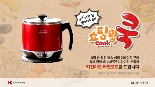 KTH는 T커머스 K쇼핑에서 ‘쇼핑 왕쿡’ 프로모션(사진)을 30일까지 진행한다고 밝혔다. 기간 내 방송상품을 3회 이상 구매한 고객 중 총 구매 금액이 20만원 이상이면 누구나 ‘키친아트 멀티쿠커(라면포트)’를 사은품으로 받을 수 있다. 사은품은 본품과 별도로 12월15일부터 순차 배송된다.