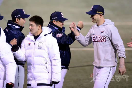 1일 창원시 마산야구장에서 ‘2016 타이어뱅크 KBO 리그’ 한국시리즈 3차전 두산베어스와 NC다이노스 경기가 열렸다. 6-0 승리를 거두며 3차전을 모두 승리한 두산 김태형 감독이 보우덴과 하이파이브 하고 있다.