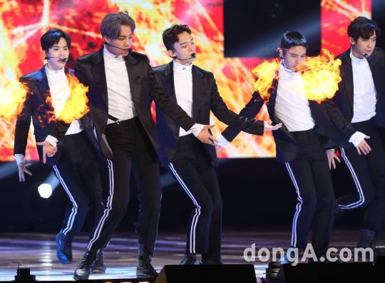 그룹 엑소가 1일 오후 서울 잠실체육관에서 열린 SBS파워 FM 20주년 콘서트에서 화려한 무대를 꾸미고 있다.