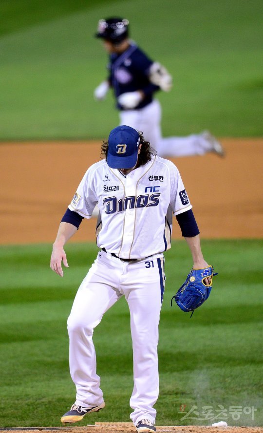 2일 창원시 마산야구장에서 ‘2016 타이어뱅크 KBO 리그’ 한국시리즈 4차전 두산베어스와 NC다이노스 경기가 열렸다. 선발 투수로 등판한 NC 스튜어트가 2회초 1사 두산 양의지에게 좌월 솔로 홈런을 허용한 후 고개를 떨구고 있다.