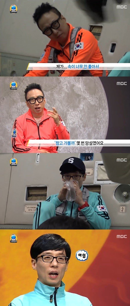 이날 유재석과 박명수는 무중력 훈련 도중 멀미 증세를 호소했고, 시간이 지날수록 상태가 악화됐다.