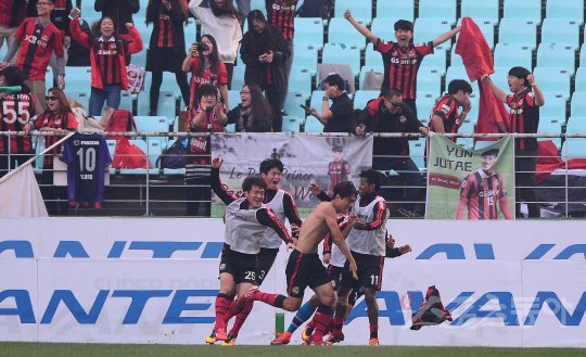 6일 전주월드컵경기장에서 열린 ‘현대오일뱅크 K리그 클래식 2016’ 38라운드 전북 현대와 FC서울의 최종전이 열렸다. 후반 FC 서울 박주영이 선취골을 넣은 후 동료들과 기쁨을 나누고 있다.