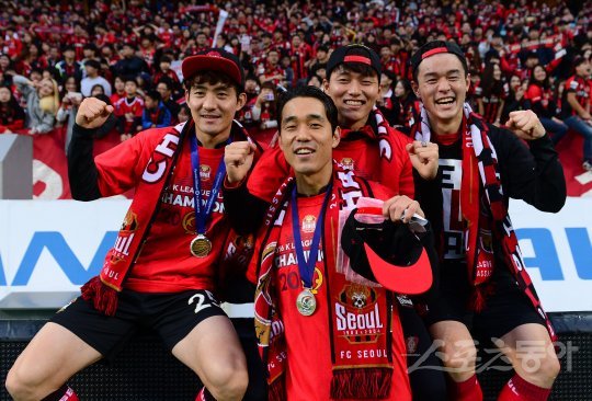 6일 전주월드컵경기장에서 열린 ‘현대오일뱅크 K리그 클래식 2016’ 38라운드 전북 현대와 FC서울의 최종전에서 FC 서울이 1-0 승리를 거두며 극적으로 우승을 차지했다. 경기 후 FC 서울 박주영(왼쪽 두 번째)이 이석현, 고광민, 주세종(왼쪽부터)과 기념촬영을 하고 있다.