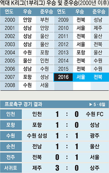 FC서울은 6일 전주월드컵경기장에서 열린 ‘현대오일뱅크 K리그 클래식 2016’ 38라운드 전북현대와의 원정경기에서 후반 13분 터진 박주영(31)의 결승골로 1-0 승리를 거뒀다. 이로써 서울은 21승7무10패, 승점 70으로 전북(20승16무2패·승점 67)을 따돌리고 역전 우승을 차지했다. 전북이 시즌 도중 불거진 소속 스카우트의 심판 로비 파문으로 인해 한국프로축구연맹으로부터 승점 9점을 깎인 덕을 봤다. 2012년 이후 4년 만에 K리그 클래식 우승컵을 되찾은 서울은 전신인 안양LG 시절을 포함해 통산 6차례 K리그 1부리그 정상을 밟았다. 서울은 우승상금 5억원을 보너스로 챙겼다.