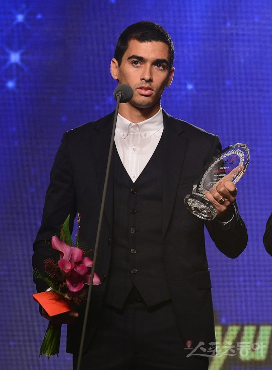 8일 서울 서대문구 홍은동 그랜드 힐튼 서울에서 ‘2016 현대오일뱅크 K리그 어워드’가 열렸다. 아디다스 올인 판타스틱 플레이어를 수상한 전북 현대 레오나르도가 소감을 밝히고 있다.