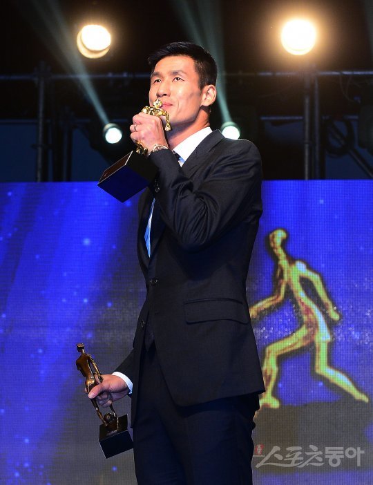 8일 서울 서대문구 홍은동 그랜드 힐튼 서울에서 ‘2016 현대오일뱅크 K리그 어워드’가 열렸다. 베스트11 FW 공격수 부문, MVP, 득점왕으로 3관왕을 차지한 광주 FC 정조국이 기념촬영을 하고 있다.