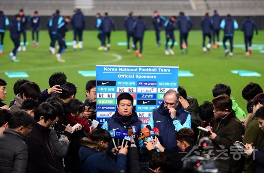 한국축구대표팀 오는 11일 캐나다와 친선경기, 15일 우즈벡과의 ‘2016 러시아월드컵 아시아최종예선’을 앞두고 8일 서울 상암 월드컵경기장에서 소집한 뒤 훈련을 가졌다. 갑작스런 추위에 슈틸리케 감독이 두터운 옷을 입고 인터뷰를 하고 있다.