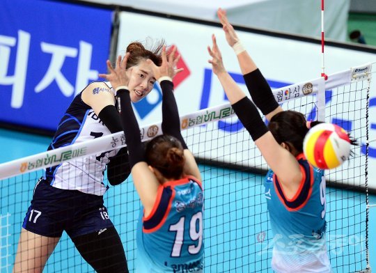 8일 서울 장충체육관에서 열린 ‘NH농협 2016~2017 V리그’ 여자부 IBK기업은행과 GS칼텍스 경기에서 기업은행 김미연이 GS칼텍스의 블로킹 사이로 스파이크 공격을 하고 있다.