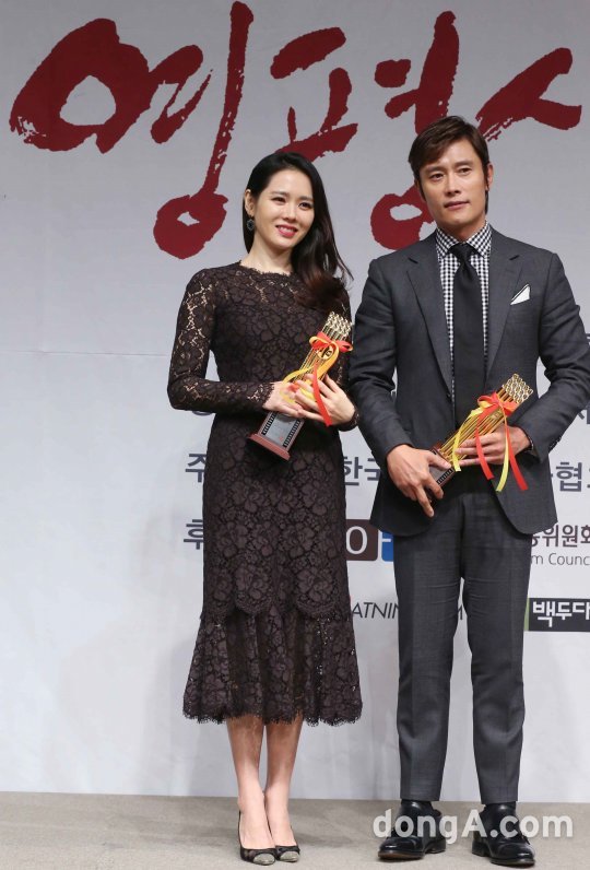 배우 손옞ㄴ(왼쪽)과 이병헌이 8일 오후 서울 중구 프레스센터에서 열린 제36회 영평상 시상식에서 연기자상을 받은 위 포즈를 취하고 있다.