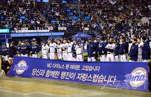 NC의 승부조작 은폐 의혹 파문이 조용하던 야구계를 덮쳤다. 선수의 승부조작 연루에 이어 구단이 이를 은폐했다는 혐의가 드러나 KBO리그를 지탱한 ‘신뢰’에도 큰 균열이 생긴 모습이다. 2일 한국시리즈 4차전에서 패해 준우승에 그친 뒤 관중들에게 인사하는 NC 선수단. 스포츠동아DB