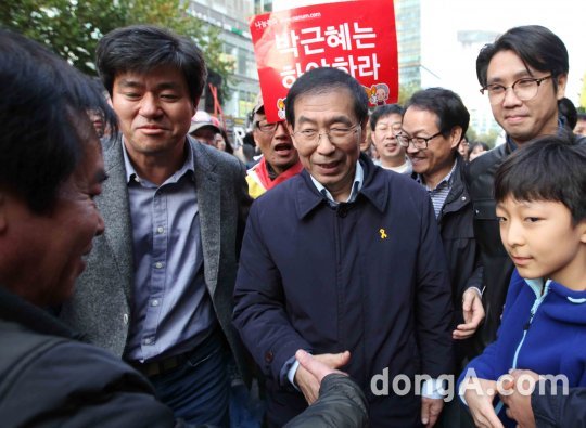 박원순 서울시장이 12일 오후 서울 광화문광장에서열린 박근혜 정권 퇴진 2016 민중총궐기 대회에 참석해 시민들을 만나고 있다.