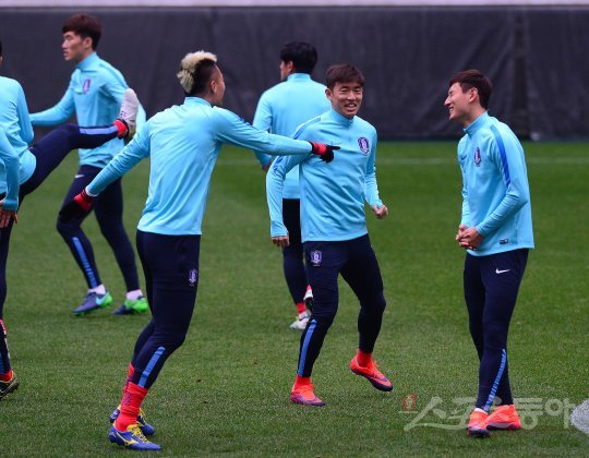 대한민국 축구대표팀이 오는 15일 우즈베키스탄과의 ‘2016 러시아월드컵 아시아최종예선’을 앞두고 13일 서울 상암월드컵경기장에서 훈련을 가졌다. 김신욱과 윤석영, 지동원(왼쪽부터)이 훈련 중 대화를 나누고 있다.