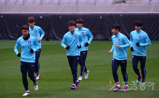 대한민국 축구대표팀이 오는 15일 우즈베키스탄과의 ‘2016 러시아월드컵 아시아최종예선’을 앞두고 13일 서울 상암월드컵경기장에서 훈련을 가졌다. 손흥민과 이청용, 박주호를 비롯한 선수들이 가벼운 런닝으로 몸을 풀고 있다.