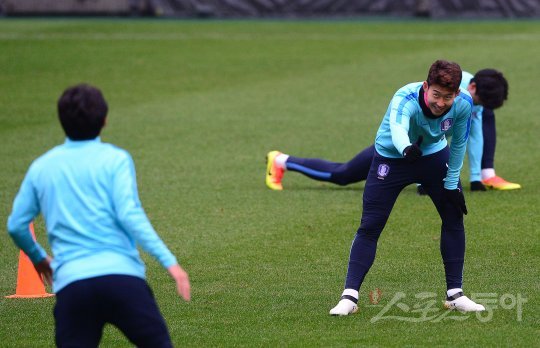 대한민국 축구대표팀이 오는 15일 우즈베키스탄과의 ‘2016 러시아월드컵 아시아최종예선’을 앞두고 13일 서울 상암월드컵경기장에서 훈련을 가졌다. 손흥민이 훈련 중 최철순(앞)에게 엄지 손가락을 내밀고 있다.