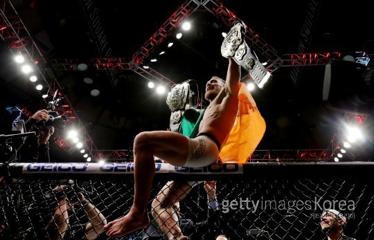코너 맥그리거가 13일(한국시간) 사상 처음으로 뉴욕 매디슨스퀘어가든에서 벌어진 종합격투기 경기 UFC 205에서 라이트급 챔피언 에디 알바레스에 2라운드 KO승을 거둬 동시에 2체급 챔피언이 된 뒤 챔피언벨트를 양손에 들고 환호하고 있다. 사진=ⓒGettyimages이매진스