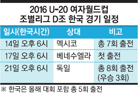 다시 시간이 흘렀다. 한국은 남태평양의 섬나라 파푸아뉴기니에서 개막한 2016 U-20 여자월드컵에 도전장을 내밀었다. 2012년 대회부터 연령별 여자대표팀 지휘봉을 잡은 정성천 감독과 태극낭자들은 14일 오후 6시(한국시간) 포트모르즈비에서 멕시코와 조별리그 D조 1차전을 치른다. 각조 2위까지 주어질 8강행 티켓을 거머쥐기 위해 첫 단추를 잘 꿰어야 한다. 베네수엘라전(17일)과 독일전(21일)에서 조금이나마 여유를 찾으려면 멕시코를 상대로 꼭 승점 3을 얻어야 한다. 특히 독일은 U-20 여자월드컵 우승을 3차례(2004·2010·2014 년)나 달성한 전통의 강호다.