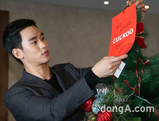 배우 김수현이 14일 오전 서울 중구 롯데호텔에서 열린 생활가전 기업 쿠쿠전자 핼시윈터 캠페인 행사에 참석해 크리스마스 트리에 카드를 달고 있다.