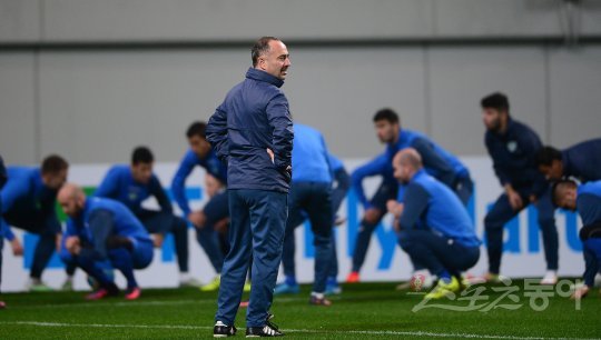 우즈베키스탄 축구대표팀이 오는 15일 대한민국과의 ‘2016 러시아월드컵 아시아최종예선’을 앞두고 14일 서울 상암월드컵경기장에서 훈련을 가졌다. 우즈벡 샴벨 바바얀 감독이 선수들의 훈련을 지켜보고 있다.