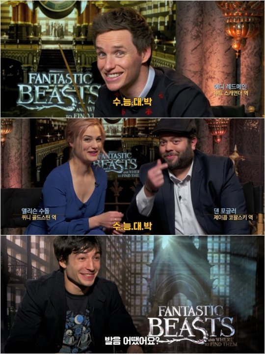 영화 ‘신비한 동물사전’의 주인공 에디 레드메인과 캐서린 워터스턴, 댄 포글러, 앨리슨 수돌과 에즈라 밀러 등 출연배우들이 17일 대학수학능력시험을 앞두고 있는 한국의 학생들을 위해 응원의 영상을 보내왔다.