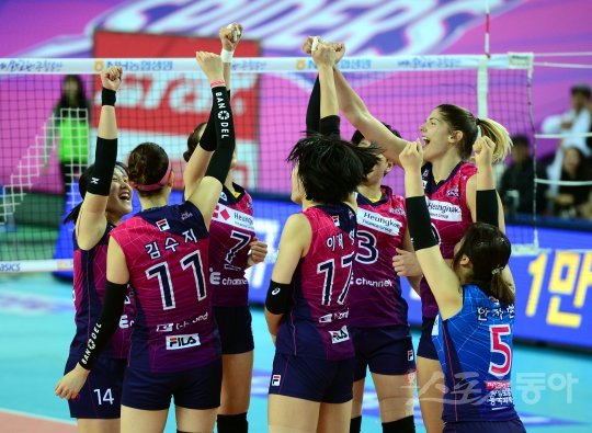 16일 인천 계양체육관에서 ‘2016-2017 NH농협 V리그’ 인천 흥국생명과 서울 GS칼텍스의 경기가 열렸다. 흥국생명이 GS칼텍스에 세트스코어 3-1로 승리한 뒤 선수들이 코트에서 기쁨을 나누고 있다.