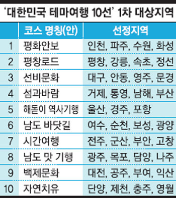 문화체육관광부(이하 문체부)는 자연치유권, 선비문화권, 남도 맛 기행 등 전국을 지역특색과 테마로 묶은 ‘대한민국 테마여행 10선’ 1차 대상지역을 선정해 16일 발표했다. ‘대한민국 테마여행 10선’ 육성은 국내외 관광객들이 서울과 제주 외의 지역에서도 질 높은 여행을 할 수 있도록 지역별 특색 있는 ‘10 대 관광코스’를 선정해 이를 집중적으로 발전시키는 프로젝트다.