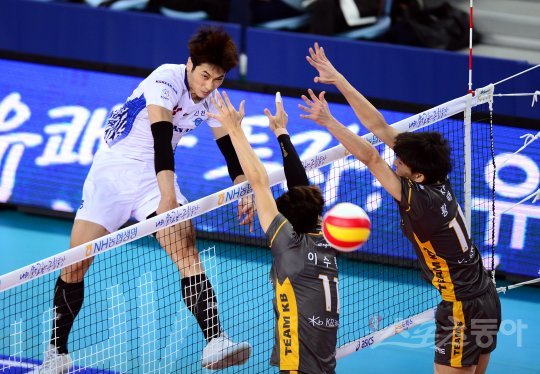16일 인천 계양체육관에서 ‘2016-2017 NH농협 V리그’ 인천 대한항공과 구미 KB손해보험의 경기가 열렸다. 대한항공 김학민이 KB손해보험 블로커를 피해 스파이크를 날리고 있다.