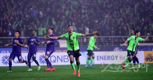 19일 전주월드컵경기장에서 2016 아시아축구연맹(AFC) 챔피언스리그(ACL) 결승 1차전 전북 현대와 알 아인(UAE)의 경기가 열렸다. 후반 전북 현대 레오나르도가 페널티킥으로 역전골을 넣은 후 세리머니를 하고 있다. 전주 | 김진환 기자 kwangshin00@donga.com