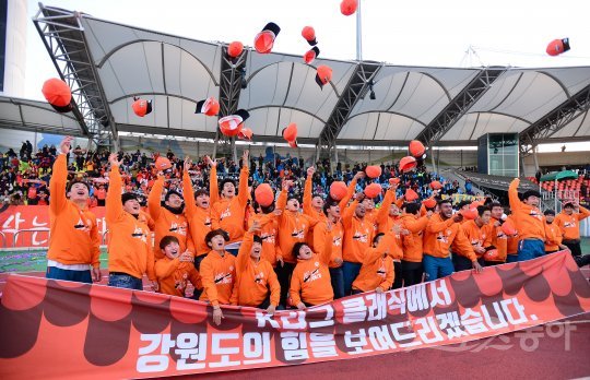 20일 성남 탄천종합운동장에서 열린 ‘현대오일뱅크 K리그 승강 플레이오프 2016 ’ 2차전 성남 FC와 강원 FC의 경기에서 강원이 1-1 무승부를 거두며 원정 다득점 원칙으로 클래식 승격을 이뤄냈다. 경기 후 강원 FC 선수들이 모자를 던지며 환호하고 있다.