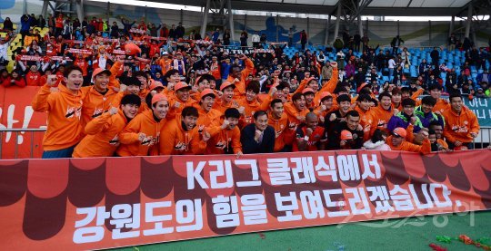 20일 성남 탄천종합운동장에서 열린 ‘현대오일뱅크 K리그 승강 플레이오프 2016 ’ 2차전 성남 FC와 강원 FC의 경기에서 강원이 1-1 무승부를 거두며 원정 다득점 원칙으로 클래식 승격을 이뤄냈다. 경기 후 강원 FC 선수단이 기념촬영을 하고 있다.