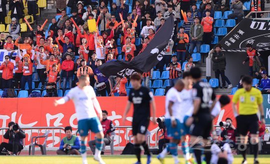 20일 성남 탄천종합운동장에서 ‘현대오일뱅크 K리그 승강 플레이오프 2016 ’ 2차전 성남 FC와 강원 FC의 경기가 열렸다. 전반 강원 FC 서포터가 성남 FC가 반칙을 얻자 옐로우 카드를 꺼내며 응원을 펼치고 있다.