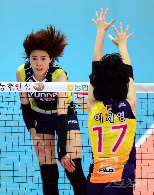 20일 수원실내체육관에서 ‘2016-2017 NH농협 V리그’ 수원 현대건설과 인천 흥국생명의 경기가 열렸다. 현대건설 이다영이 스파이크를 날렸으나 쌍둥이 언니인 흥국생명 이재영의 블로킹에 막히고 있다.