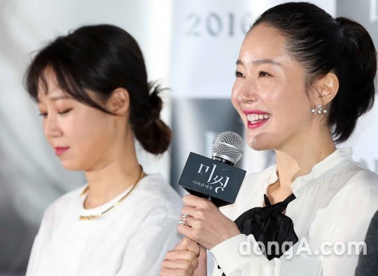 배우 엄지원(오른쪽)이 21일 오후 서울 동대문구 한 멀티플렉스관에서 열린 영화 '미씽: 사라진 여자' 언론시사회에서 인사말을 하고 있다.