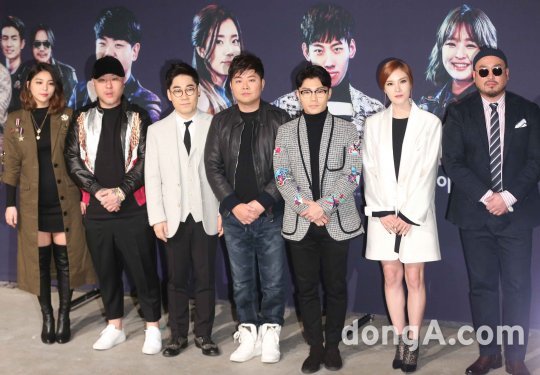 가수 에일리, 용감한 형제, 김연우, 한성호 대표, 김범수, 거미, 길(왼쪽부터)이 22일 오전 서울 강남구 청담 씨네시티 엠큐브에서 열린 방송 슈퍼스타K 2016 TOP7 기자간담회에 참석해 포즈를 취하고 있다.