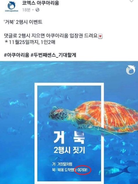 코엑스 아쿠아리움의 공식 페이스북에는 ‘거북 2행시 이벤트’라면서 “댓글로 2행사를 지으면 아쿠아리움 입장권을 증정한다”고 올라왔다.