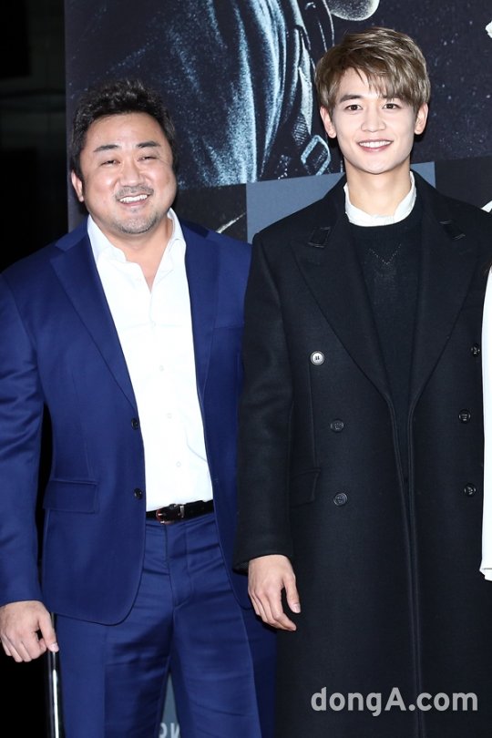 배우 마동석(왼쪽), 최민호가 22일 오후 서울 용산구 용산CGV에서 열린 영화 '두남자' VIP시사회에 참석해 포토타임을 하고 있다.