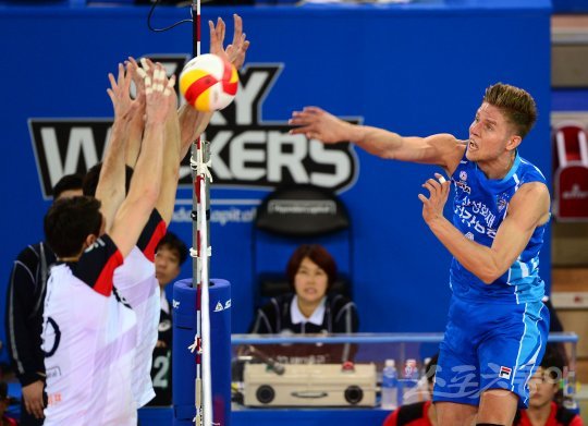22일 천안 유관순체육관에서 ‘2016-2017 NH농협 V리그’ 현대캐피탈과 삼성화재의 경기가 열렸다. 2세트 삼성화재 타이스가 현대캐피탈 블로커의 수비를 앞에 두고 스파이크 공격을 하고 있다.