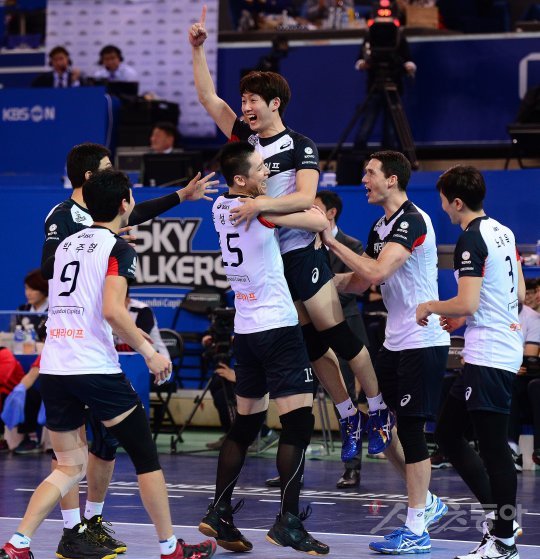 22일 천안 유관순체육관에서 ‘2016-2017 NH농협 V리그’ 현대캐피탈과 삼성화재의 경기가 열렸다. 3세트 현대캐피탈 이시우가 서브 에이스를 성공 후 동료들과 기쁨을 나누고 있다.