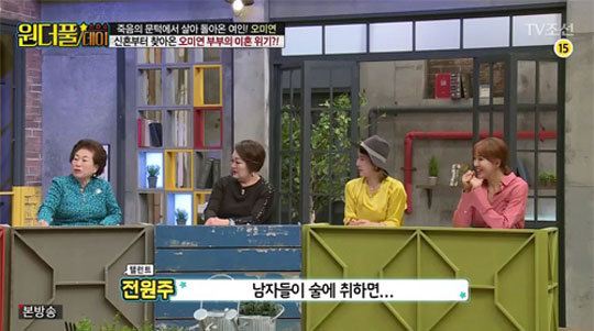 22일 밤 방송된 종합편성채널 TV조선 ‘스타쇼 원더풀데이’(이하 원더풀데이)에서 전원주는 “남자들이 술에 취하면 제정신이 아닌 건 확실한 듯”이라며 입을 열었다.