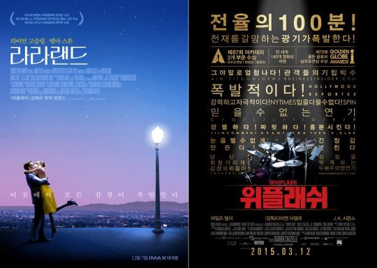 ‘라라랜드’ 역시 배우 지망생과 재즈 연주가를 주인공으로 사랑에 빠지는 황홀한 순간부터 꿈을 향한 격렬한 열정, 좌절과 절망, 그리고 이를 극복해가는 과정에서의 벅찬 감흥 등 다양한 감정들을 폭넓게 그려내며 관객들의 마음을 사로잡는다. 또한 ‘위플래쉬’가 재즈 선율에 담긴 명품 음악을 선보였다면, ‘라라랜드’는 재즈는 물론 신나는 음악과 춤, 노래까지 더해 더 큰 즐거움을 선사한다.